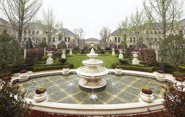 蓝城法式排屋借鉴了法国古典主义立面构图,采用纵横三段式,几何感强烈,轴线明确,主从清晰。底层厚重,中层是虚实相映的柱廊,顶部是水平厚檐。细节处理上采用了古典柱式、山花、线角等,制作工艺精细考究。在立面处理上多采用法国古典主义建筑符号,例如三段式立面、古典柱式、坡屋顶、窗套、老虎窗等。